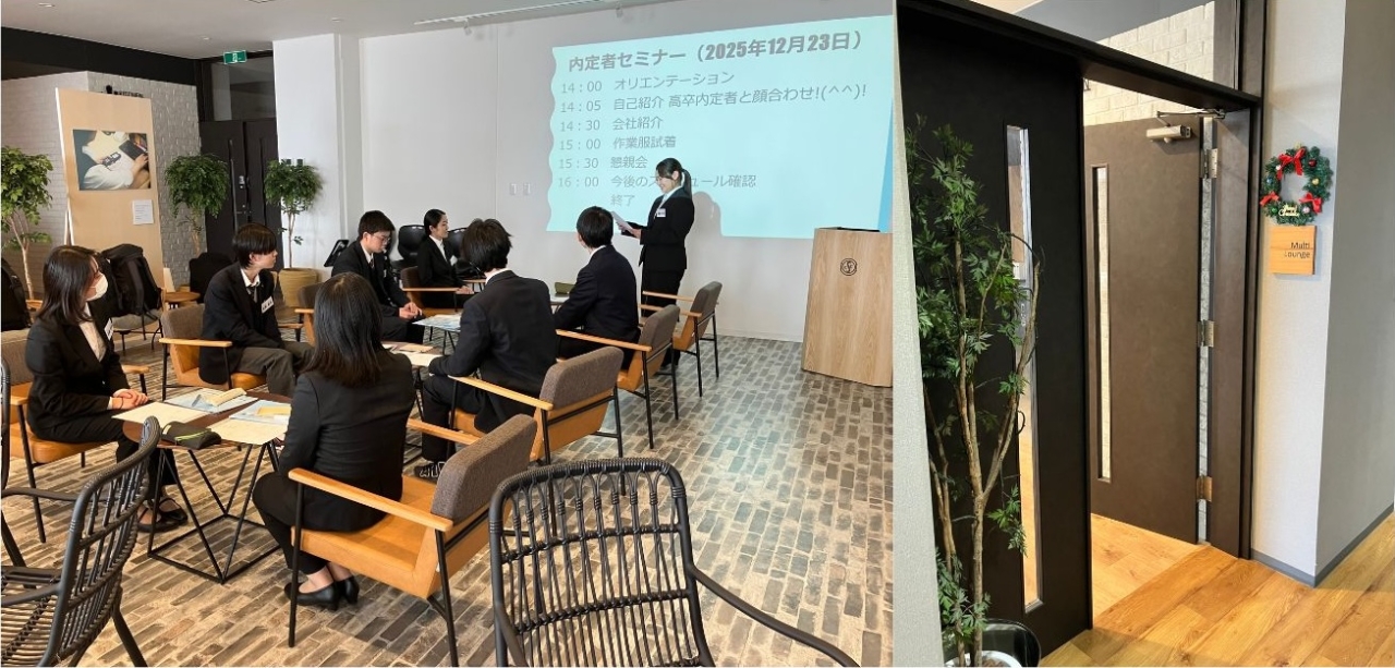 12月23日、2026年度入社予定の内定者を対象に、第4回目となる内定者セミナーを開催しました。 本セミナーは、内定者同士の交流を深め、入社に向けた準備をサポートすることを目的としています。 今回は、大卒・高卒内定者が初めて一堂に会する機会となり、新たに高校生内定者3名が参加しました。異なる背景を持つ仲間同士が顔を合わせ、終始和やかな雰囲気の中で進行しました。 セミナーでは、ブランドブックを活用した会社説明に加え、社内の清掃活動「クリーン作戦」や、仙台市・小田急電鉄株式会社様と進めているシステムについても紹介。当社の取り組みや社会との関わりについて理解を深めていただきました。 また、作業服の試着を通して、現場研修や仕事へのイメージを具体的に持つきっかけともなりました。 最後は、マルチラウンジでの懇親会を実施。クリスマス直前ということで、会場にはリースを飾り付け、季節感のある空間の中でケーキを囲みながら歓談し、さらに交流を深めるひとときとなりました。 今後も、内定者の皆さんが安心して入社を迎えられるよう、引き続きサポートを行ってまいります。